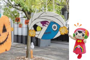 このハロウィン飾りの中に、ハロウィンヴァージョンの「おおさきちゃん」が隠れているよ。みんな、ぜひさがしてみてね!
