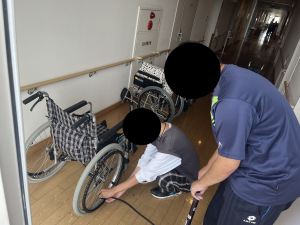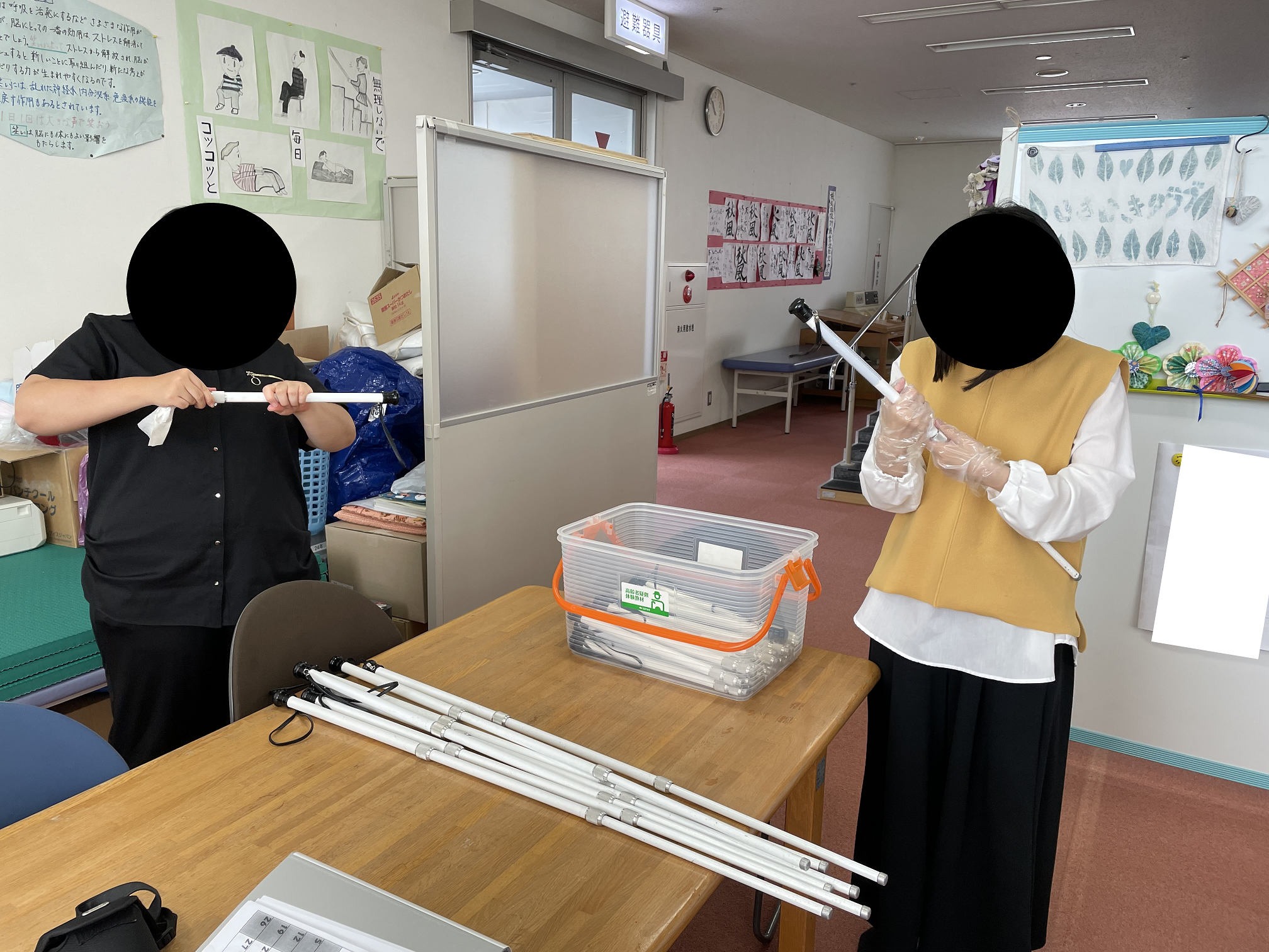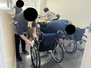 地域の方や子供たちが清潔な状態で使用することができるよう、白杖、車椅子、高齢者疑似体験セットを一つ一つ丁寧に清掃しました。