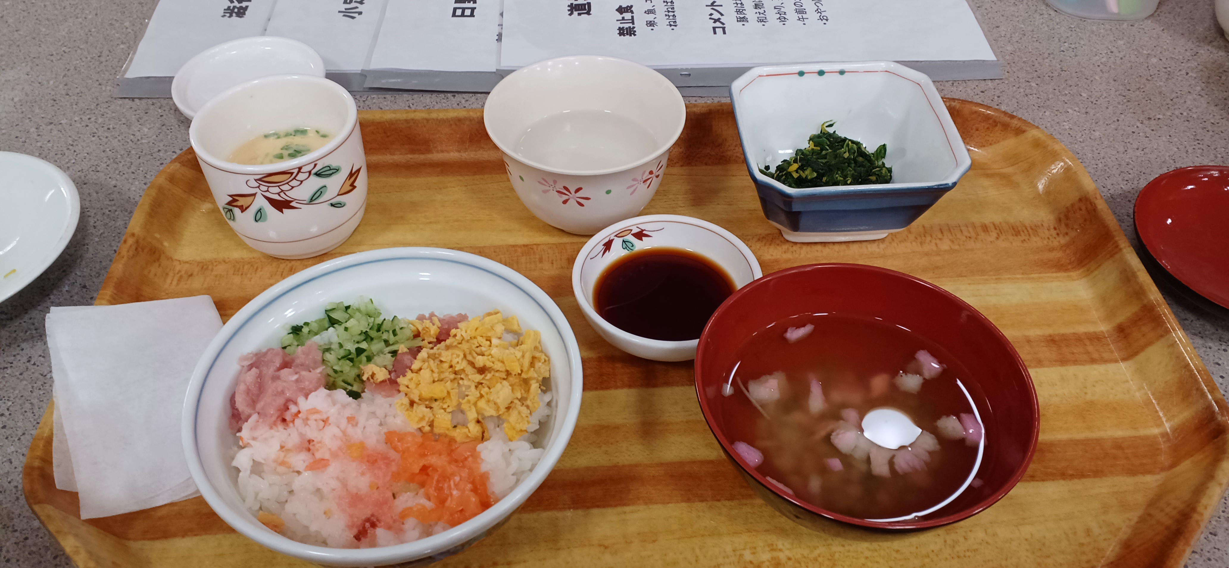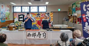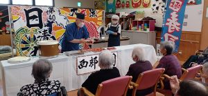 実演では大漁旗やのぼりで飾られたテーブルで大将に握り寿司を作っていただきました。酢飯の香りがする中、大将のお話も楽しく「美味しそうだね」・「お寿司を握っている姿を見るなんて凄い」と笑顔が多くみられていました。嗜好や食事形態に合わせ、握りのお寿司だけでなくちらし寿司の提供も行っていただきました。大将の「おかわりいかがですか?」の声に「サーモンお願いします」・「玉子が食べたい」等とおかわりする方も多く「お腹いっぱい」・「私、何個食べた?」とお話される姿もありました。