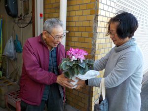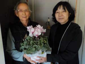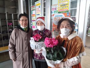 サンサンふれあい訪問では、小牛田農林高等学校の学生達が丹精込めて育てた「シクラメン」の鉢花にメッセージカードを添えたものを、いのちのバトン登録者宅へ担当地区民生委員に同行いただき、見守り活動を兼ねお一人お一人へお渡ししました。