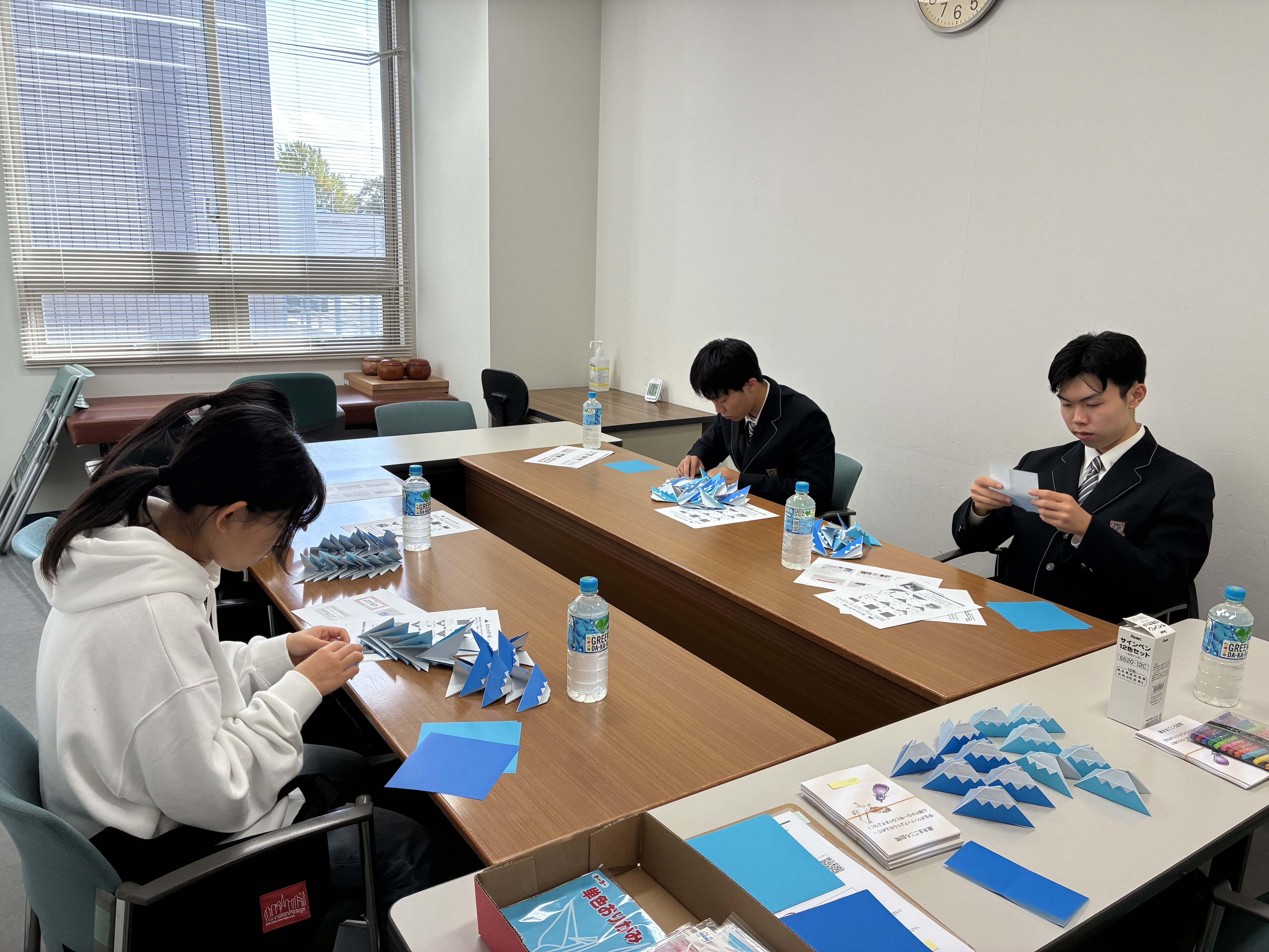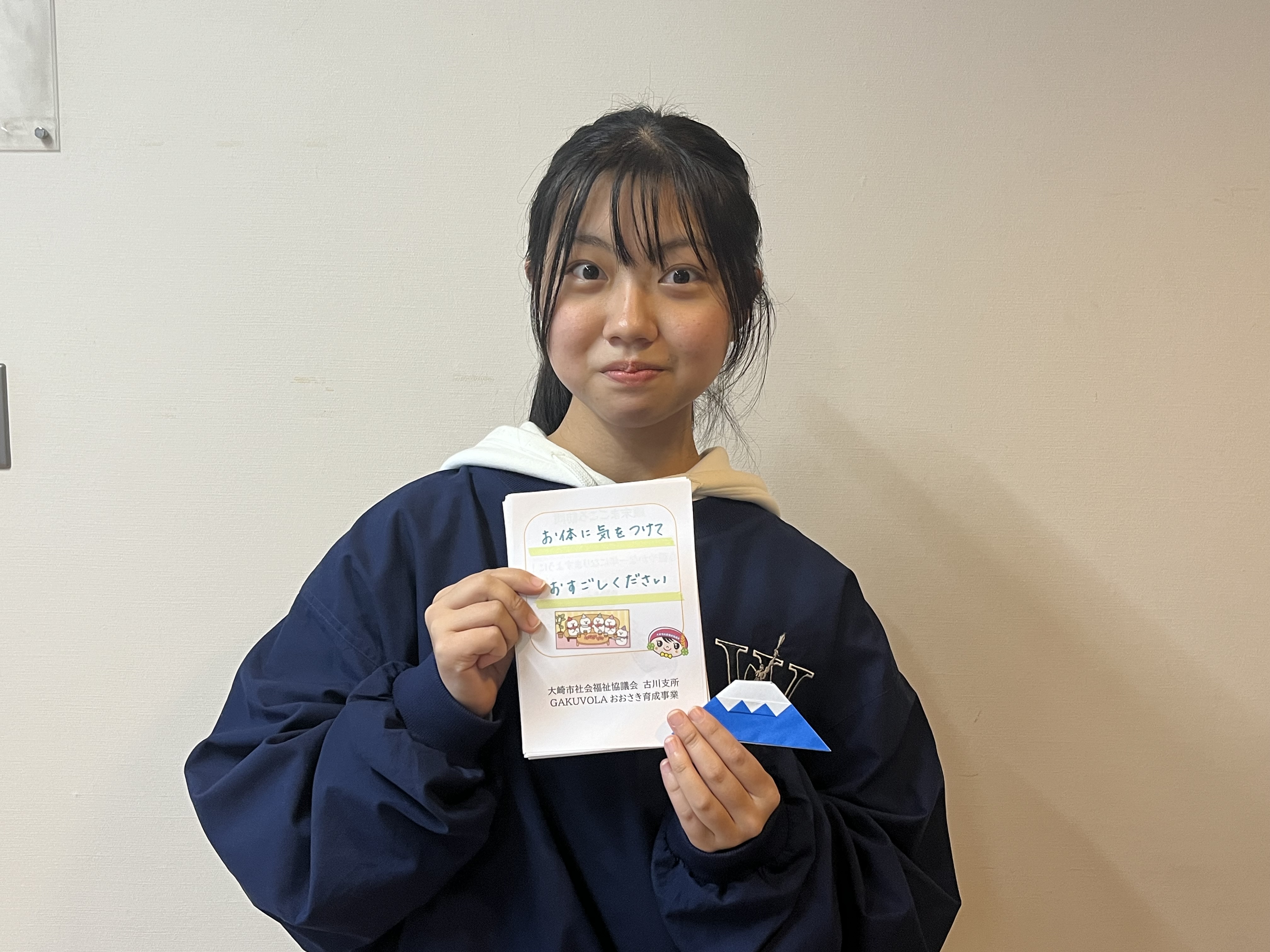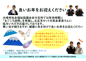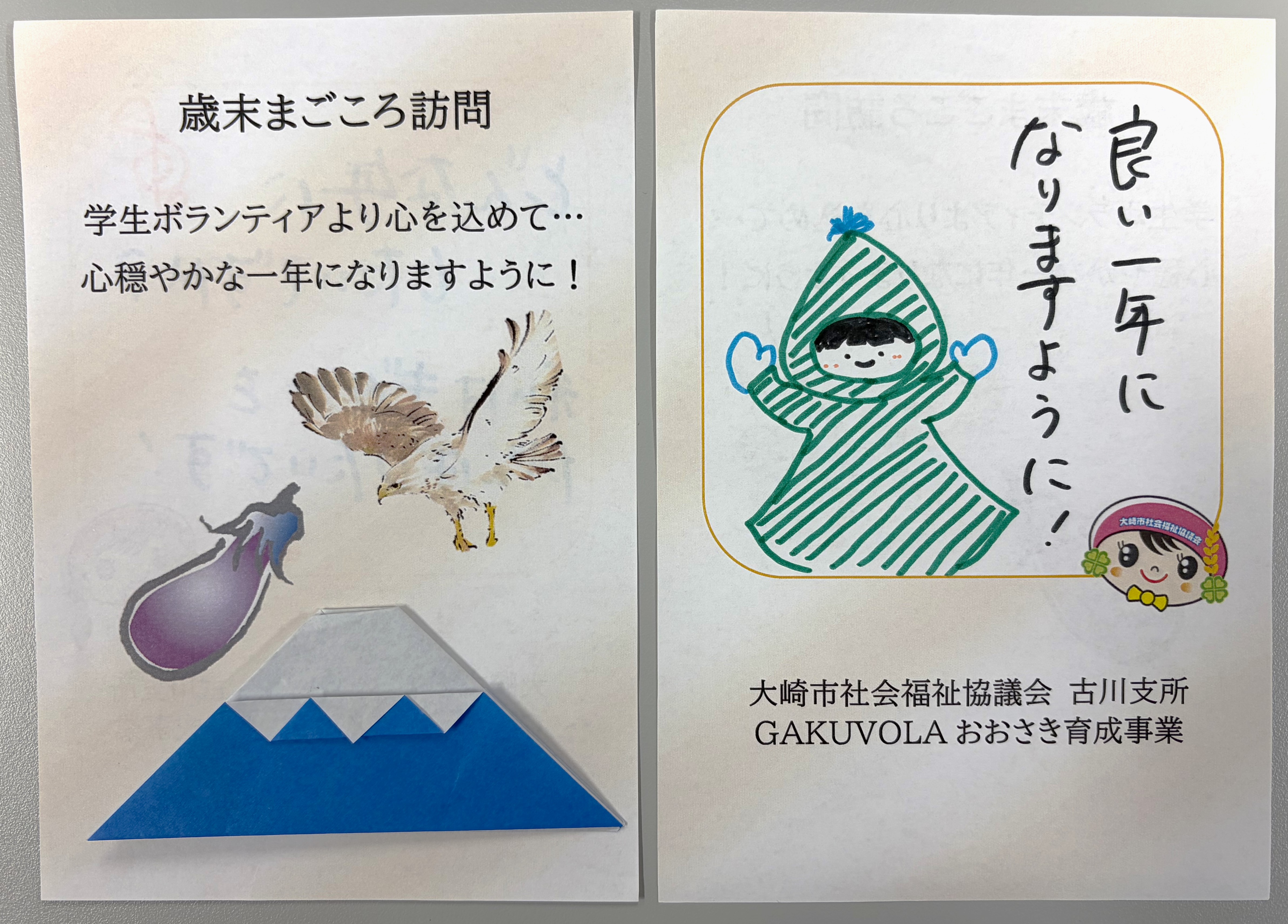今回の訪問では、おせちセットと古川地域内の学生ボランティア(GAKUVOLAおおさき育成事業)が折り紙で作成した「富士山」を対象者へお渡しいただきました。「一富士二鷹三茄子」ということで、受け取られた方が縁起の良い初夢から一年の良いスタートをきれるよう願いを込めて作りました。今年は在宅でもできるボランティアとしても募集をし、自宅でボランティアをしてくださった学生さんもいます!