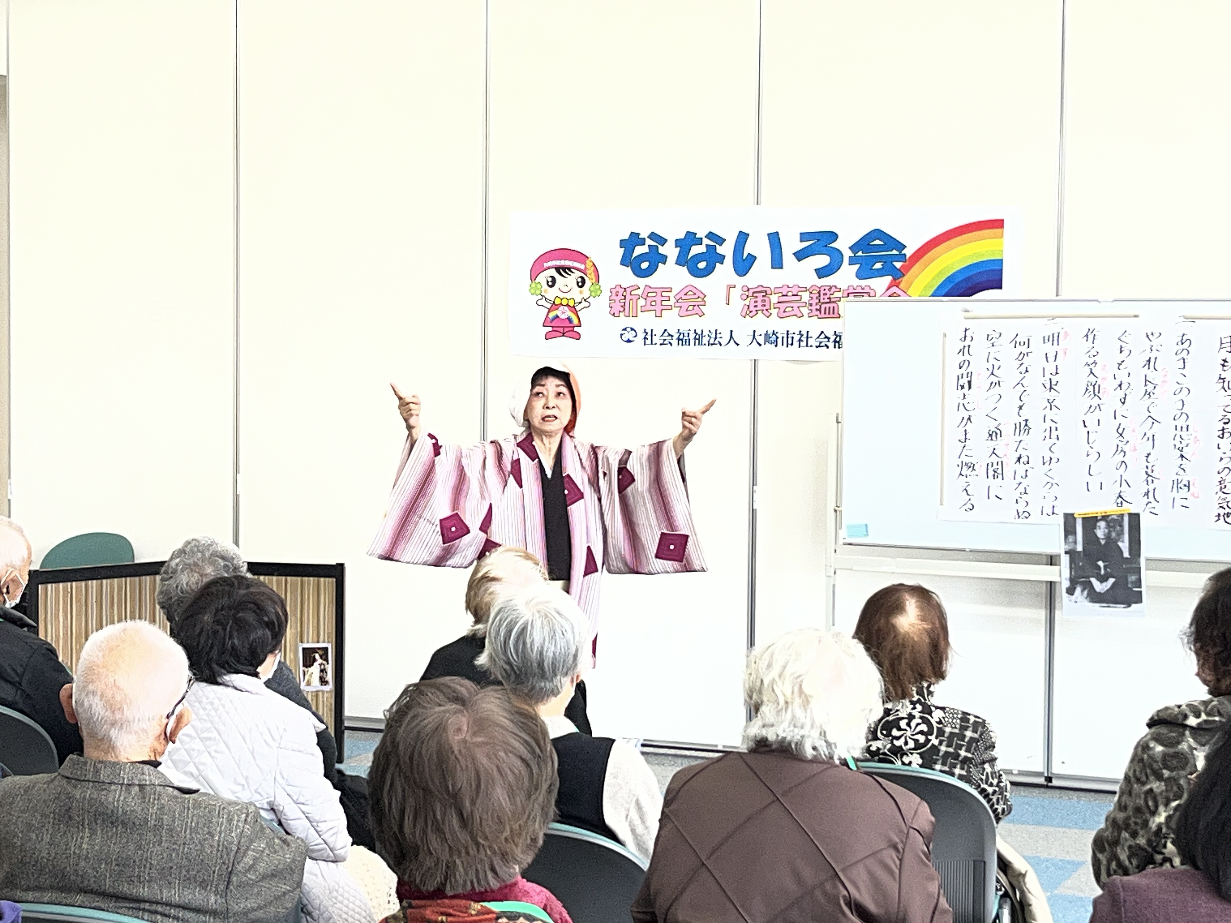 当日は、各地の介護施設を訪問し活躍されている鴇田明美さんをお招きし、迫力ある一人芝居をはじめ、華やかな日本舞踊など、多彩な演目をご披露いただきました。