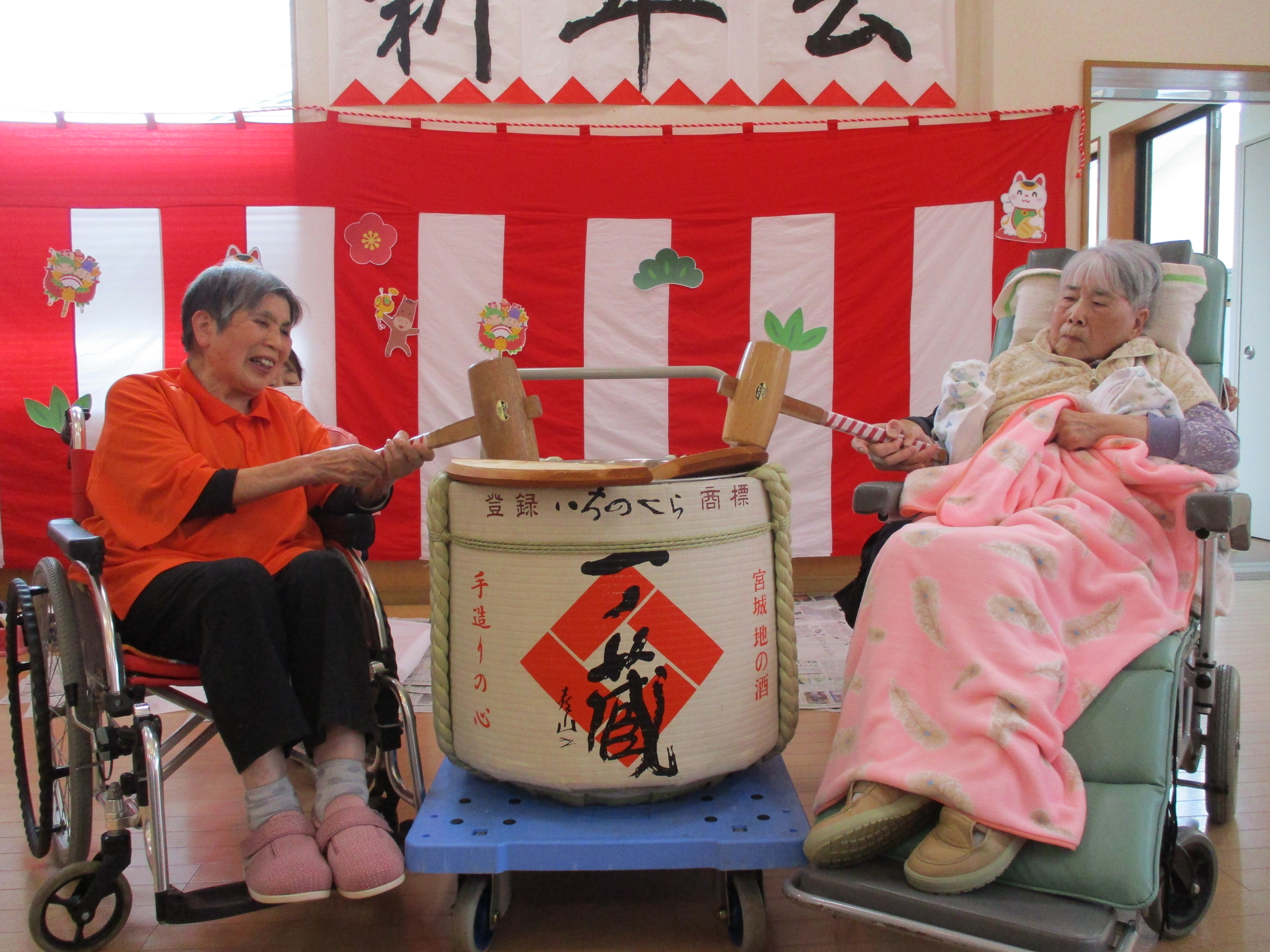 北棟新年会では、利用者様の中から今年の年男・年女、また各長寿祝いを迎えられる皆様に鏡開きを行っていただきました。皆様の掛け声に合わせて酒樽の蓋を開き、新年の幕開けを祝いました。