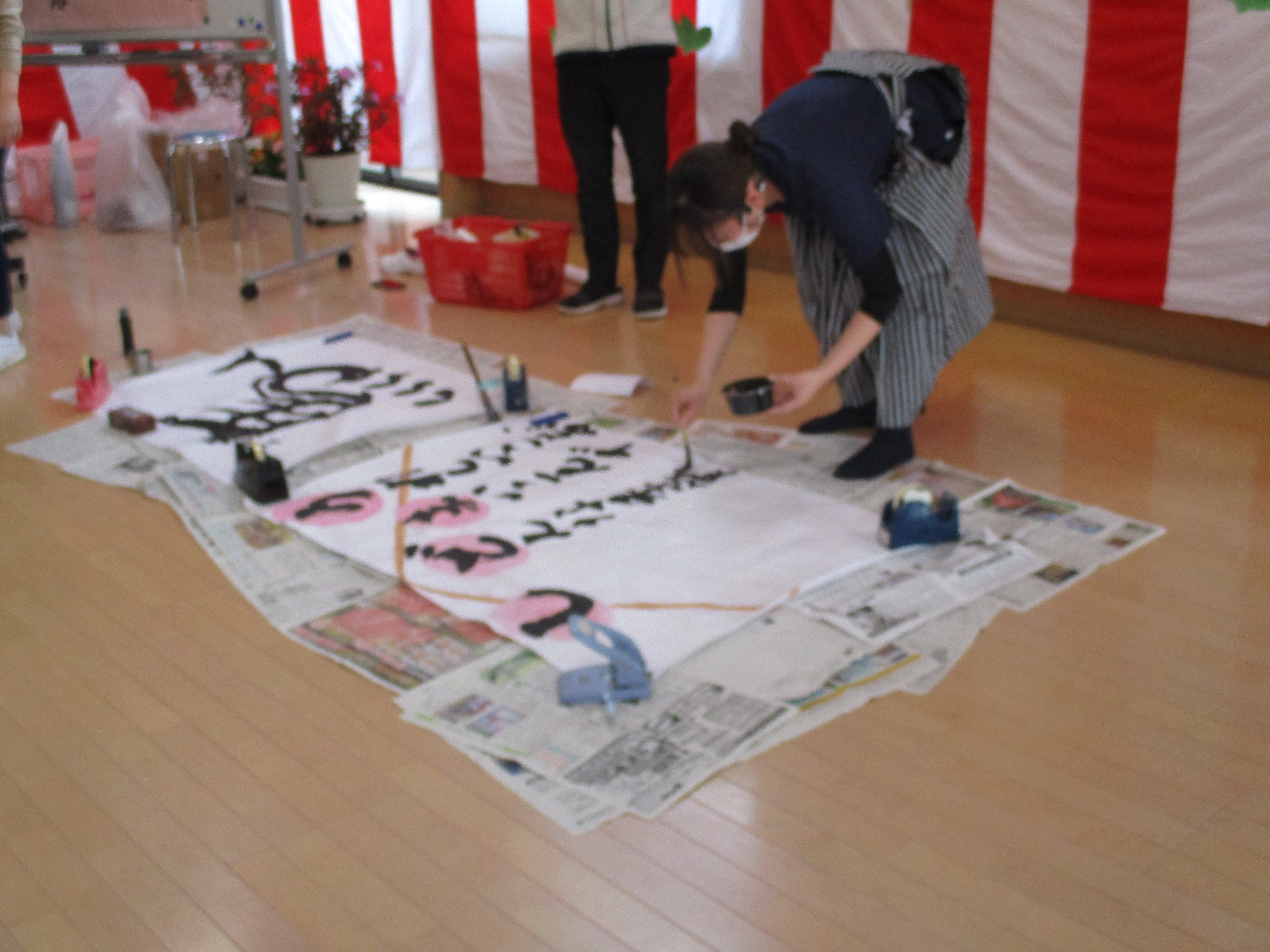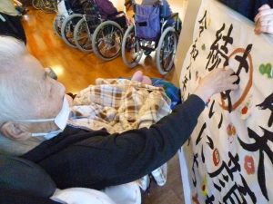 続く余興では、職員が力強い筆使いで「馬」の一字と、「う・ま・ど・し」を用いたあいうえお作文の書初めを披露。会場からは大きな拍手が送られました。最後には獅子踊りを行い、利用者様の一年間の健康を祈願しました。