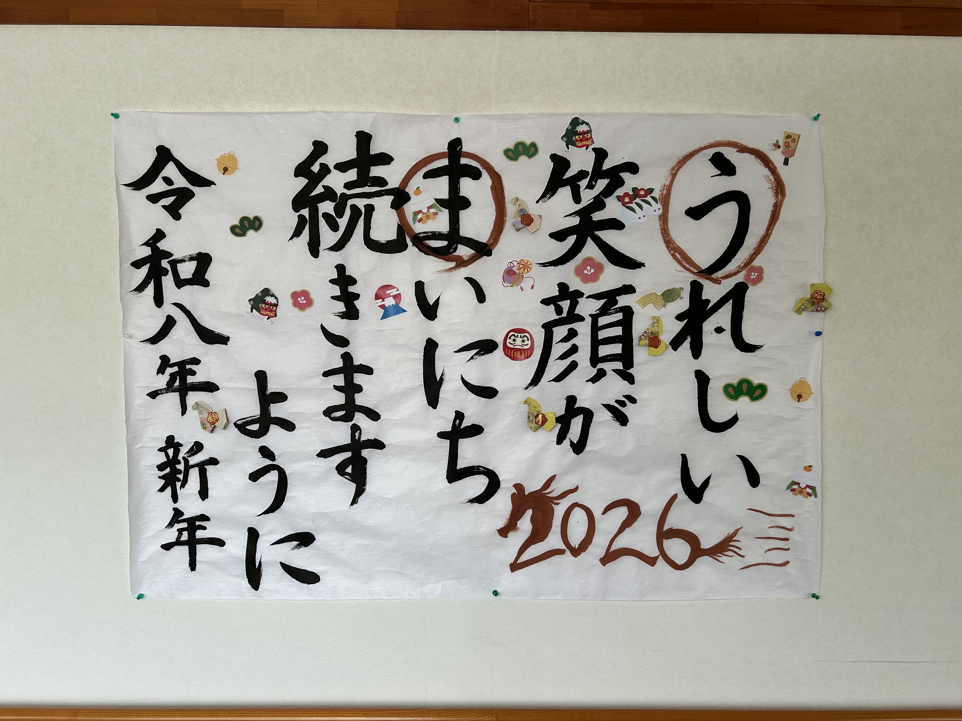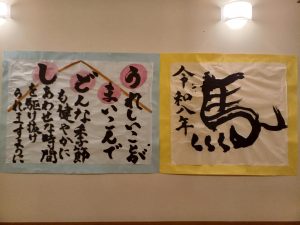 その後、職員が事前に用意した「う・ま」の文字が隠れた書初めに飾り付けを行い、最後は皆様で記念撮影。代表の利用者様による閉会のあいさつで締めくくられました。