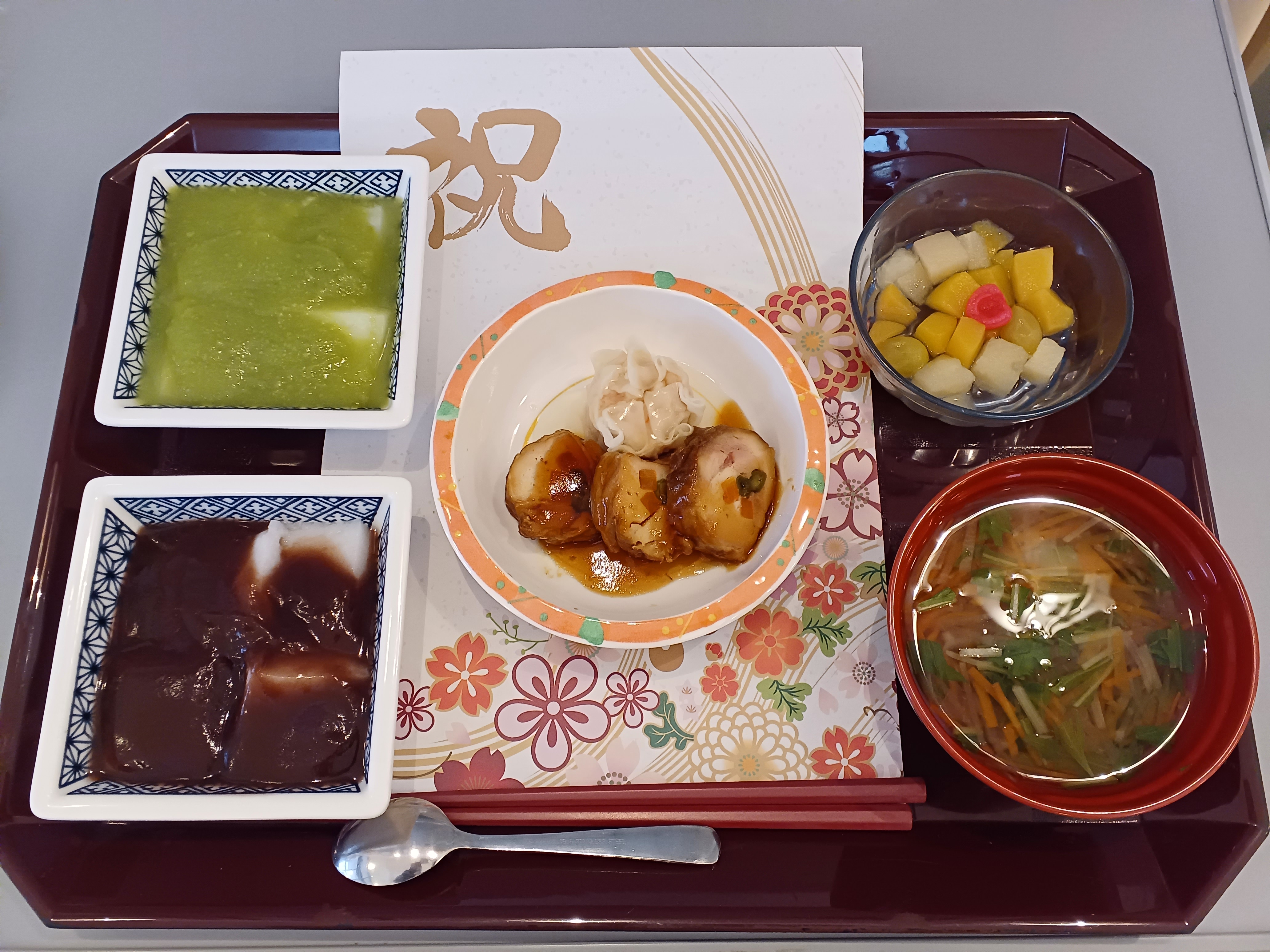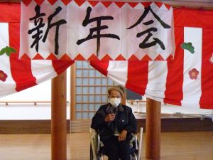 南棟新年会では、今年一年の無病長寿を願い、清涼飲料水でお屠蘇気分を味わいながら乾杯を行いました。年女の方と喜寿を迎えられる利用者様に乾杯のごあいさつをいただき、和やかな雰囲気の中で会がスタートしました。