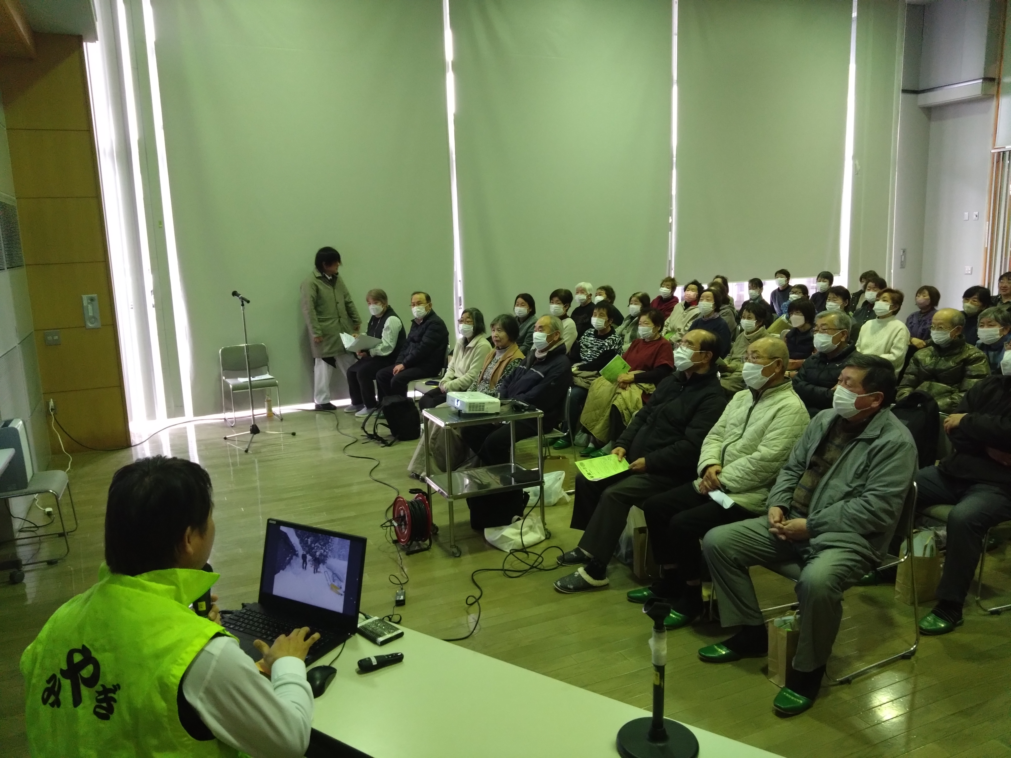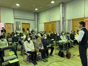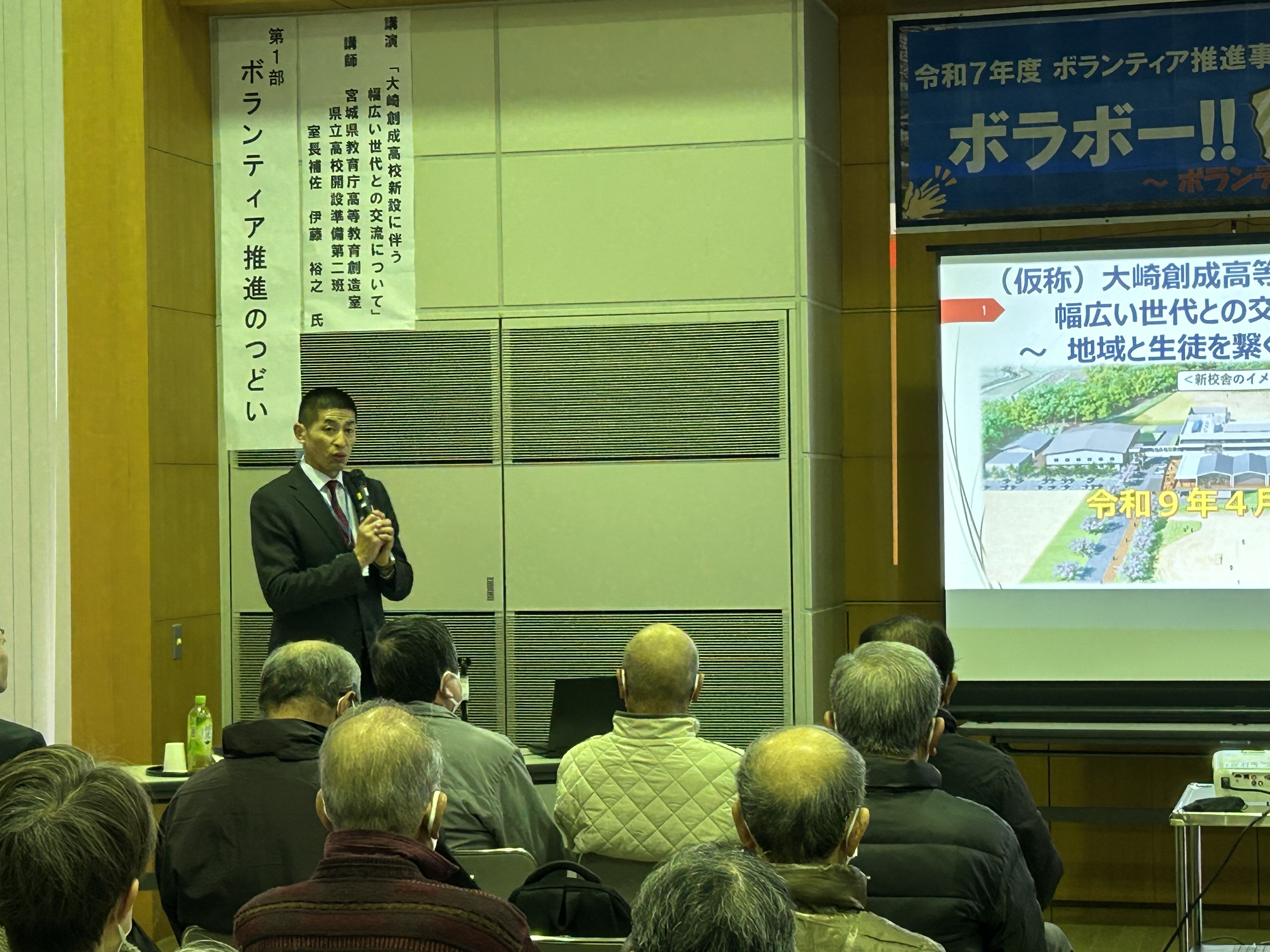 第1部は「ボランティア推進のつどい」と題し、宮城県教育庁高等教育創造室 県立高校開設準備第二班の伊藤裕之室長補佐による講話のほか、松山ボランティア活動連絡協議会 髙橋会長より、岩手県大船渡市赤崎町への災害支援の報告や、来年度実施予定の「松山こども・地域食堂」についての説明がありました。
