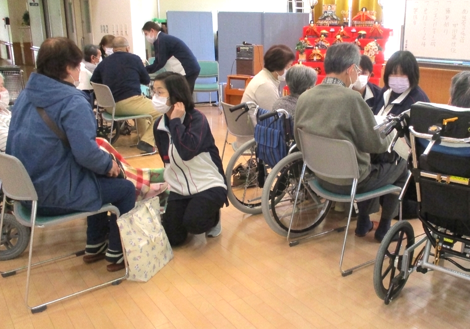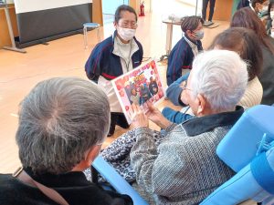 また、開催前の待ち時間に、本日の記念に「ひな壇飾り」をバックに記念撮影した写真をお渡し、ユニット職員からの近況報告やご家族様との意見交換なども行われました。