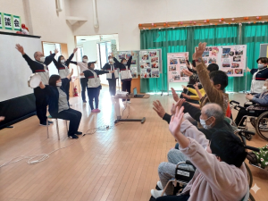 ご利用者様お一人おひとりの施設での生活の様子のスライドショーの上映、令和7年10月より週2回ご利用者様が行われている機能訓練の運動を、ご家族様も一緒に体験しました。